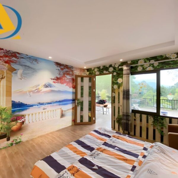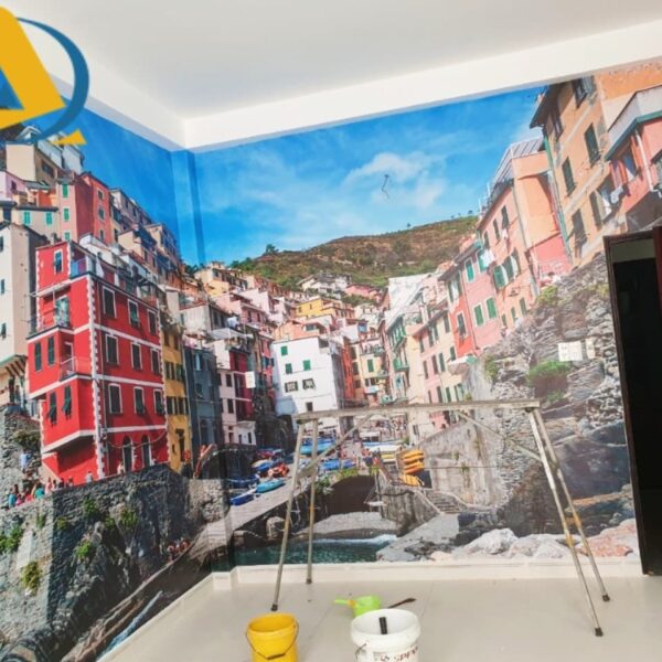 Mẫu tranh dán tường 3D phòng ngủ phố núi
