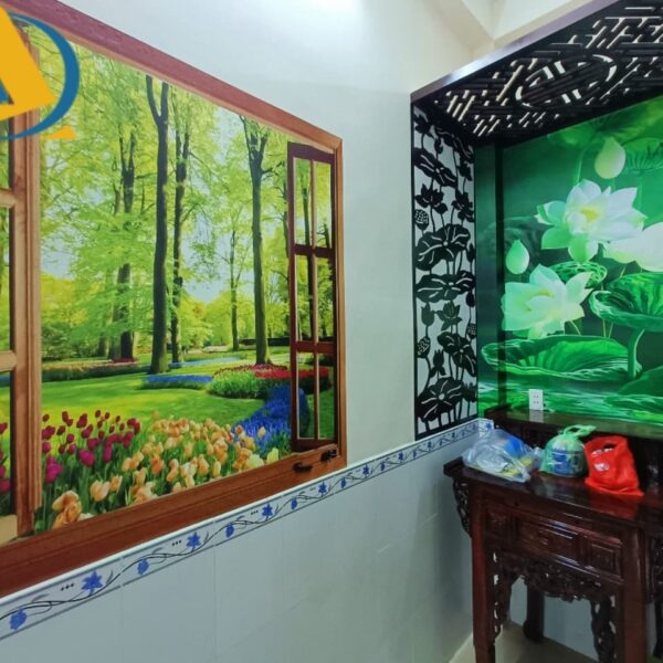 Tranh dán tường phòng thờ hoa sen cửa sổ