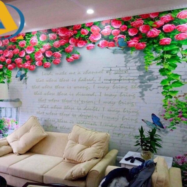 Tranh dán tường phòng khách hoa hồng tường gạch