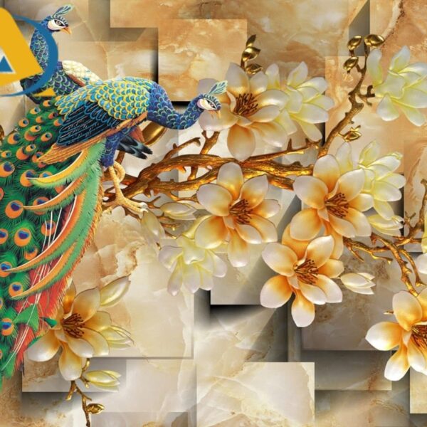 Tranh dán tường 3D chim công điểm nhấn phòng khách là một trong những mẫu tranh dán tường 3D được yêu thích nhất trong năm mới tết đến với họa tiết hoa văn tinh tế, màu sắc tươi sáng, và tạo nên không gian sống động và phong phú cho các căn phòng.