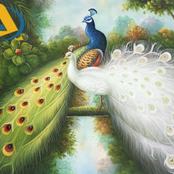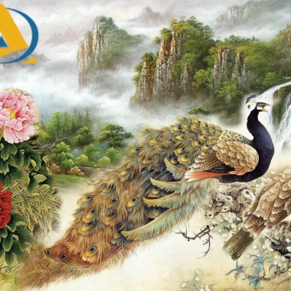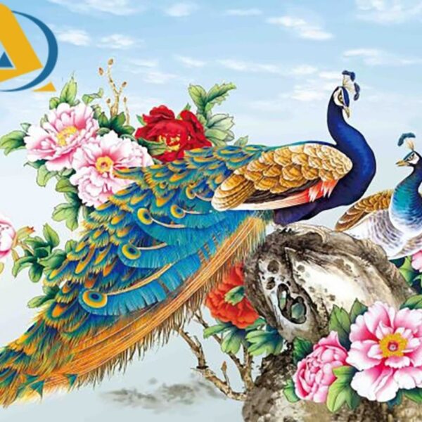 Tranh dán tường 3D chim công điểm nhấn phòng khách được sản xuất từ các tấm vật liệu như giấy, vải, với hình ảnh được in hoặc vẽ trực tiếp lên bề mặt, tạo nên những hình ảnh chân thực và sống động.