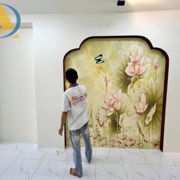 Tranh dán tường hoa sen do Sài Gòn Á Đông thực hiện được thiết kế tỉ mỉ, phù hợp phong cách nội thất phòng làm việc, giúp tạo không gian làm việc hiệu quả và cân bằng phong thủy.