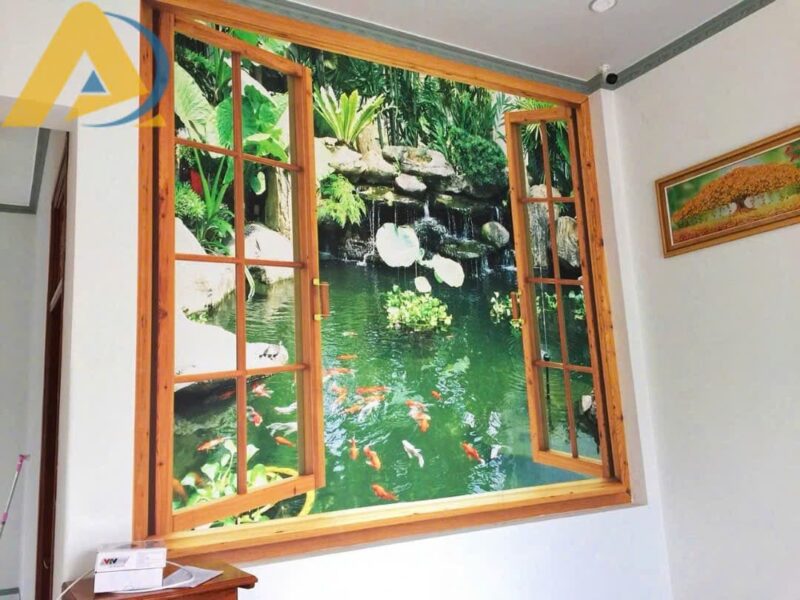 Tranh dán tường khung cửa sổ hồ cá do Sài Gòn Á Đông thực hiện được thiết kế tỉ mỉ, phù hợp phong cách nội thất phòng khách, giúp tạo không gian tiếp đón hiệu quả và cân bằng phong thủy.